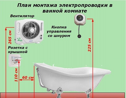 Учитывая необходимость отвода влажного воздуха допустимо использовать систему принудительной вентиляции. Но ее электродвигатель следует размещать не ниже 2,65 метра от уровня пола ванной комнаты, а для управления его работой применять только дистанционные кнопки. Их размещают не ниже 2,25 м и переключают подергиванием за свисающий шнур.