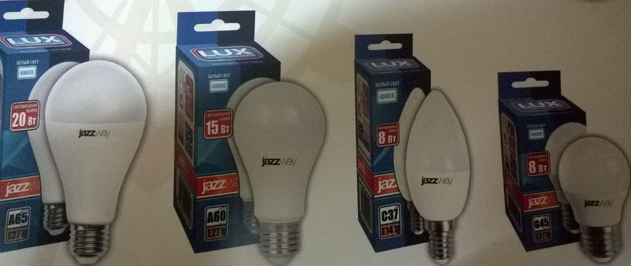 Лампы LED A60-груша, C37-свеча, свеча на ветру, G45-шар марка JazzWay