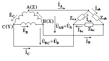 На схемах трехфазных цепей начала фаз обозначают первыми буквами латинского алфавита (А,В,С), а концы - последними буквами (X,Y,Z).