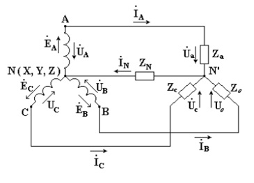 Провода, идущие от источника к нагрузке называют линейными проводами, провод, соединяющий нейтральные точки источника Nи приемника N' называют нейтральным (нулевым) проводом.
